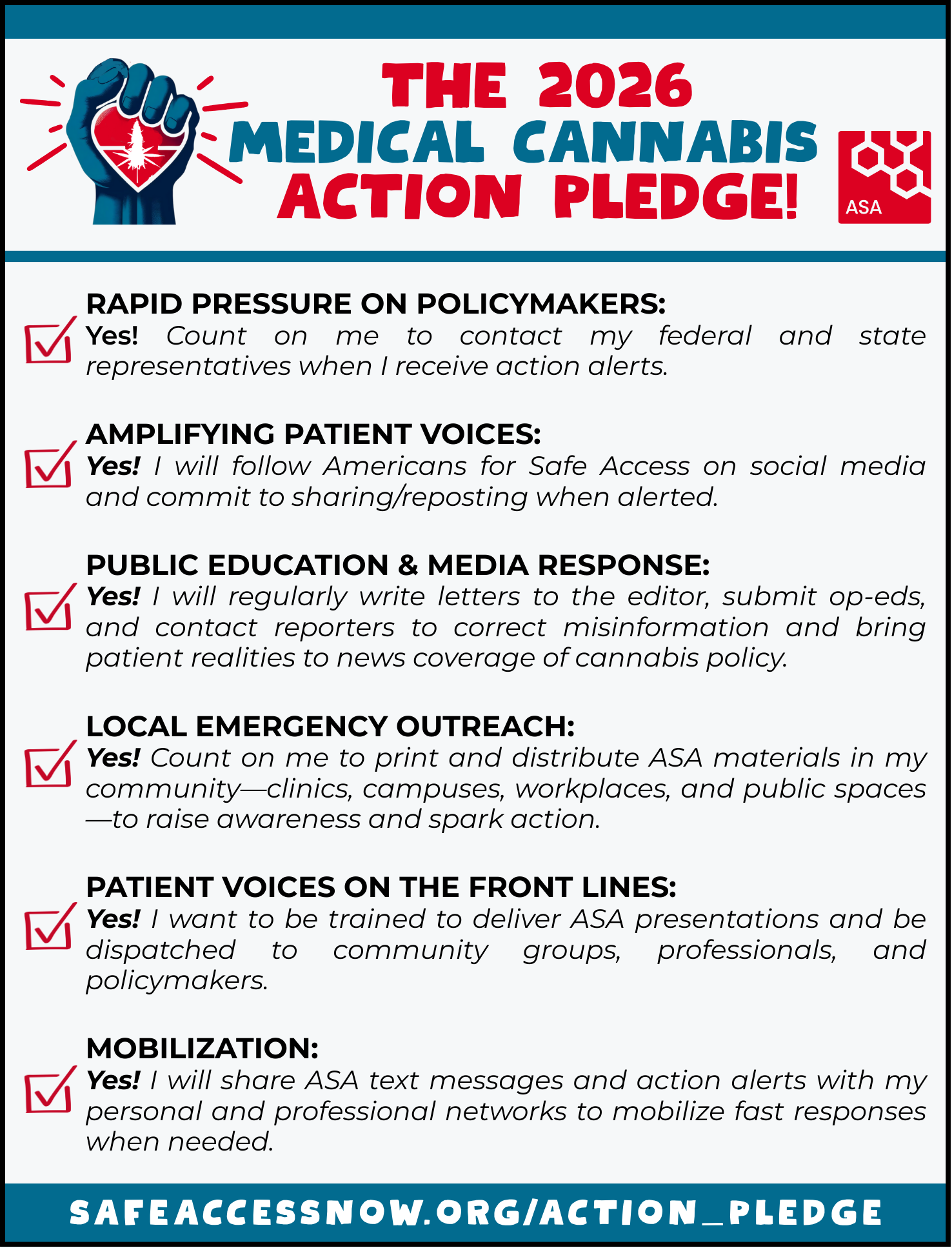 The Medical Cannabis Action Pledge is ASA’s call to patient advocates to turn New Year’s resolve into real-world impact. This isn’t a symbolic signature. It’s a commitment to be part of Medical Cannabis Organizing in 2026—and to take action when it matters most. Your capacity may change over time, and your commitments can be updated. Advocacy should be sustainable, not performative. But participation is the point.