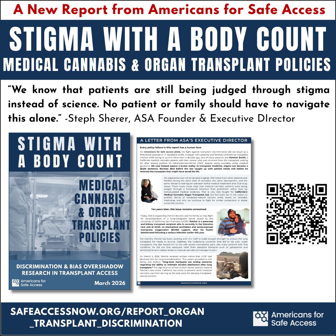 Patients and families experiencing transplant discrimination related to medical cannabis are encouraged to contact Americans for Safe Access by filling out the organ transplant discrimination intake form.